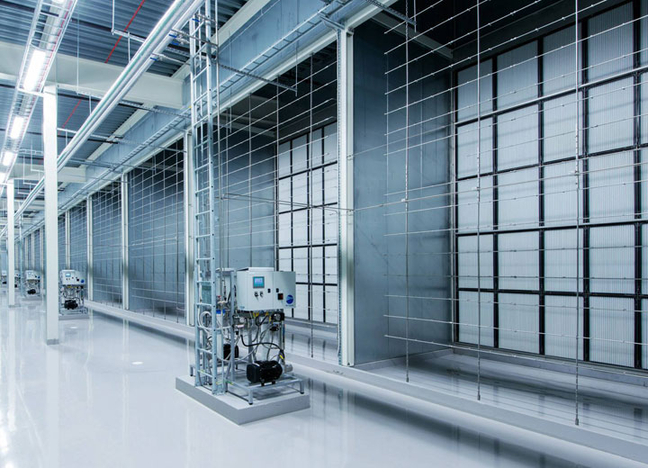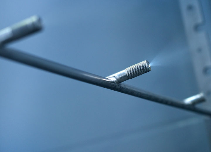 噴嘴管路與高壓泵站和水處理設備連接,水在輸入噴管之前所含的礦物質就已經被移除,管內壓力保持在60-70bar之間。一個泵站可為安裝在多個空調箱中的噴嘴管路提供最大1300kg/小時的加濕量。這套系統可提供的加濕量很大,等焓降溫量最高達884kW,而耗電量卻僅為2.2kW。