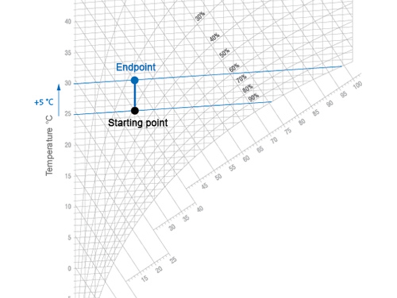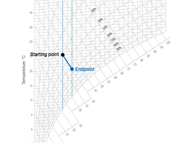 如果將空氣從溫度11°C,相對濕度50%開始加熱至25°C,在此過程中,含濕量為 4 g/kg保持不變。另一方面,相對濕度從50%改變為20%, 焓值也從 21.4 kJ/kg 變為35 kJ/kg。空氣密度也發生了變化,從1.24kg/m3 變成1.17 kg/m3。