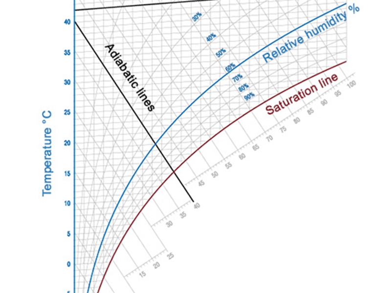 如果沒有經過額外加熱將水霧化或者蒸發,蒸發過程所需要的能量來自周圍的空氣。其結果是空氣溫度下降,這一冷卻過程是平行于等焓線,稱為等焓加濕。焓濕圖中的熱濕比線?h/?x 可以確定這一冷卻過程線的精確方向。