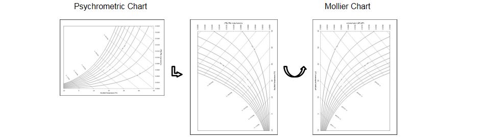 兩種焓濕圖所用的基礎數據是一樣的,psychrometric chart焓濕圖上面畫出了比容線和等濕球溫度線,德國,中國教材一般使用莫里耶焓濕圖(Mollier),其他歐美國家一般使用 psychrometric chart焓濕圖。兩種焓濕圖通過旋轉和翻轉即可以顯示出相同的幅面展示方式。