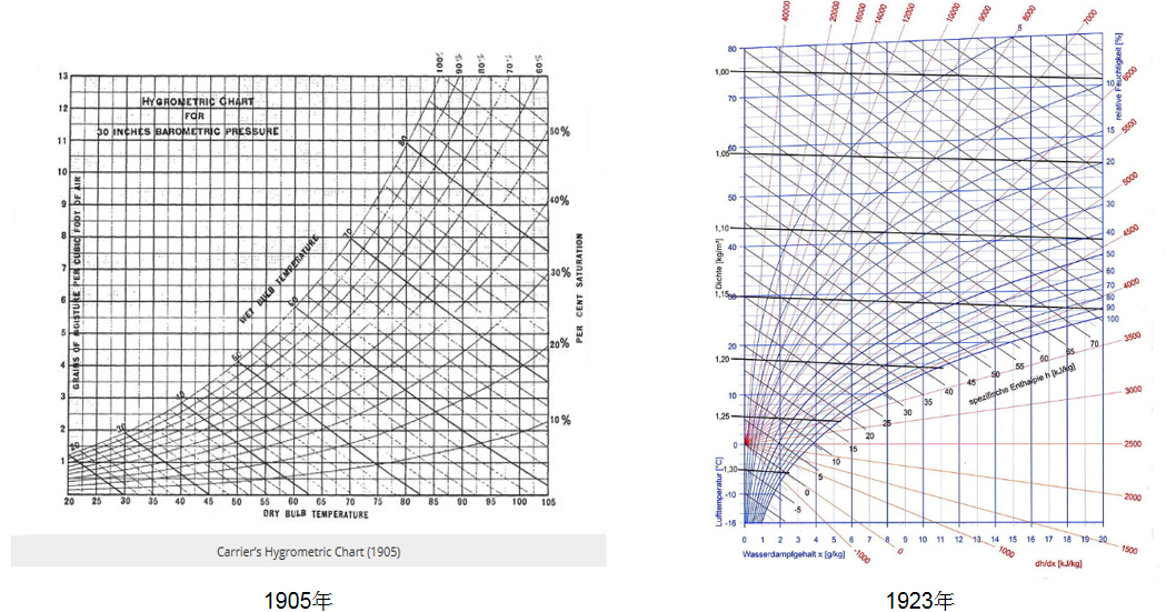 自二十世紀初以來,從H.米勒到開利博士等,都發表了不同的版本的焓濕圖。1905年,開利博士(Willis H. Carrier)發布了他繪制的焓濕圖(psychrometric chart)。1923年,Richard Mollier發表了優化的h-x焓濕圖。所以焓濕圖自發明至今已經有一百多年的歷史了。